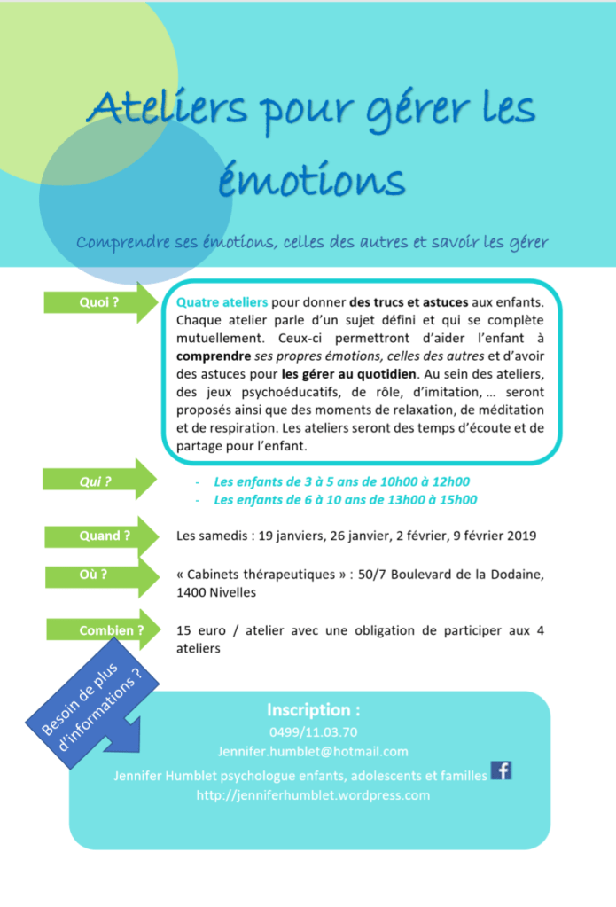Ateliers Atelier découverte- 12 janvier 2019 Formulaire d’inscription Ateliers – Gestion émotionnelle – 19, 26 janvier, 2 et 9 févier 2019 Formulaire d’inscription Partager : Partager sur X(ouvre dans une nouvelle fenêtre) X Partager sur Facebook(ouvre dans une nouvelle fenêtre) Facebook J’aime chargement…